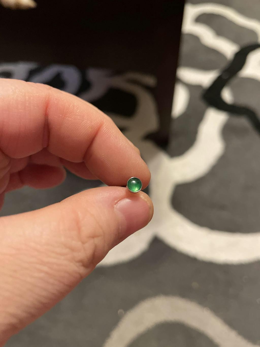 These 20 gauge green aventurine stud earrings are made from high polish grade 23 titanium (Ti 6Al-4V ELI ASTM F136). The minimalist bezel setting lets the 5mm green aventurine cabochon dominate. The wearable length measures 1/4" (6.5mm) to the notch.