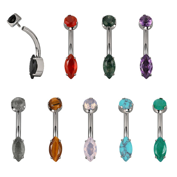 The 14 gauge marquise belly ring is made from high polish grade 23 titanium (Ti 6Al-4V ELI ASTM F136) with internal threading. The top end is removable and the bottom is fixed. Choose your gem color below.