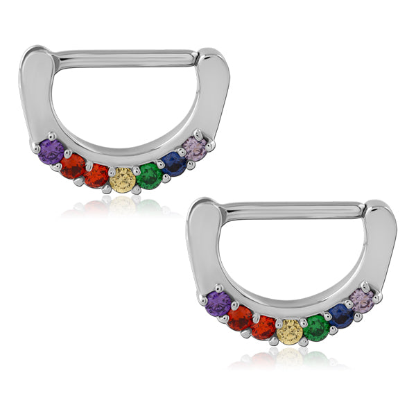 These 14 gauge rainbow nipple clickers are made from 316L stainless steel. The barbell is hinged on one side and snaps firmly shut on the other.