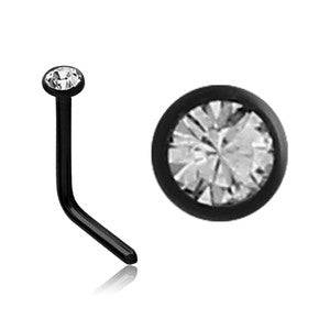 The L-bend nose stud is made from black PVD coated 316L stainless steel with 1/4" wearable area. The bezel-set 2.35mm cz is available in clear only. Choose your size below.