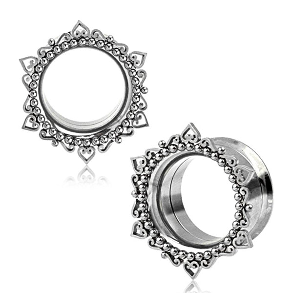 These double flare bali heart screw-on tunnels are made from 316L stainless steel. They have a wearable area of 5/16" between flares. Choose your size below.