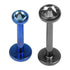 The 14 gauge labret barbell is made from high polish grade 23 titanium (Ti 6Al-4V ELI ASTM F136) with internal threading. Only the 3mm bezel-set gem end is removable. The fixed disc end has a 5mm diameter. These cannot be returned or exchanged if you select a custom anodized barbell color. Only the high polish (plain silver) is eligible for our return policy. Choose your size and colors below.