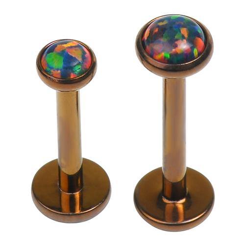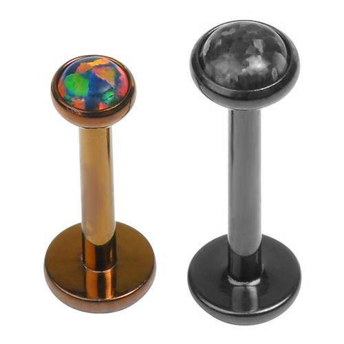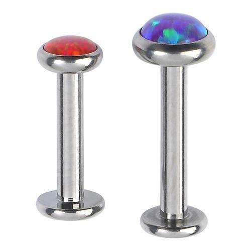 The 14 gauge labret barbell is made from high polish grade 23 titanium (Ti 6Al-4V ELI ASTM F136) with internal threading. Only the 3mm bezel-set opal end is removable. The fixed disc end has a 5mm diameter. These cannot be returned or exchanged if you select a custom anodized barbell color. Only the high polish (plain silver) is eligible for our return policy. Choose your size and color below.