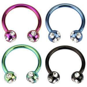 The 14 gauge circular barbell is made from PVD coated 316L stainless steel with external threading. Both multi-gem balls are removable. Gems are available in clear only. Choose your size and color below.