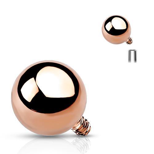 The 14 gauge ball replacement end is made from rose gold PVD coated 316L stainless steel. These will fit most any 14 gauge internally threaded straight barbell or labret. We cannot guarantee compatibility with curved barbells. Choose your size below.