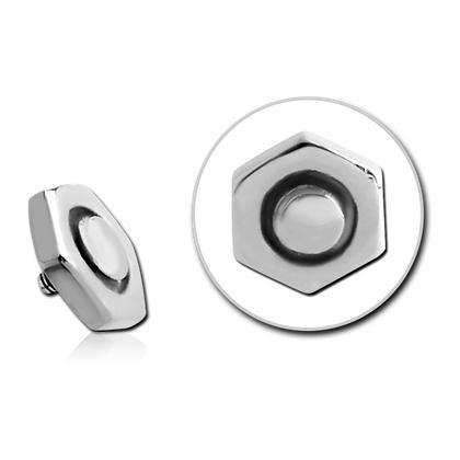 The 14 gauge hex nut is made from 316L stainless steel. It has a 6.6mm diameter. These will fit most any 14 gauge internally threaded straight barbell, labret or dermal anchor. We cannot guarantee compatibility with curved barbells.