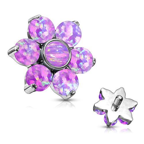 The 14 gauge opal flower is made from 316L stainless steel with 2mm prong-set opals. These will fit most any 14 gauge internally threaded straight barbell, labret or dermal anchor. We cannot guarantee compatibility with curved barbells. Choose your synthetic opal color below.