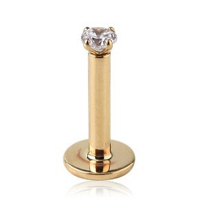 The 16 gauge labret barbell is made from solid 14k yellow gold with internal threading. The prong-set cz gemstone is available in clear only. It's hypoallergenic, nickel free, and polished to a mirror finish.