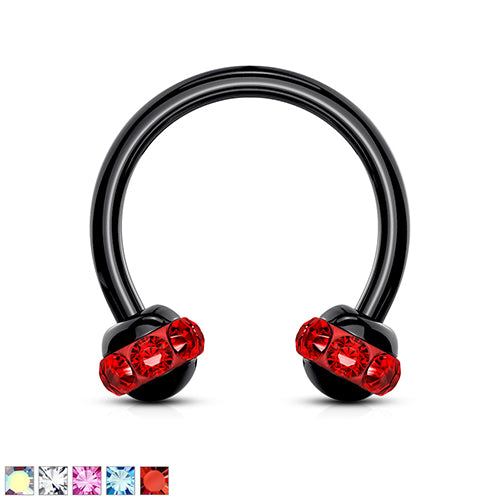 The 16 gauge circular barbell is made from black PVD coated 316L stainless steel with external threading. Both gem ball ends are removable. Choose your color below.