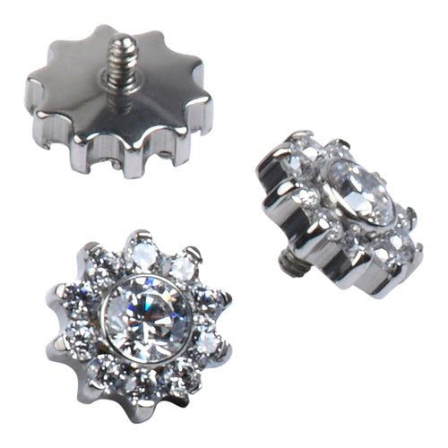 The 16 gauge CZ sunflower is made from high polish grade 23 titanium (Ti 6Al-4V ELI ASTM F136). These will fit most any 16 gauge internally threaded straight barbell or labret. We cannot guarantee compatibility with curved barbells. Choose your cz color below.