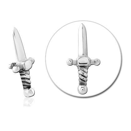 The 16 gauge dagger end is made from 316L stainless steel. They measure about 8.9mm high x 4.2mm wide. These will fit most any 16 gauge internally threaded straight barbell or labret. We cannot guarantee compatibility with curved barbells.