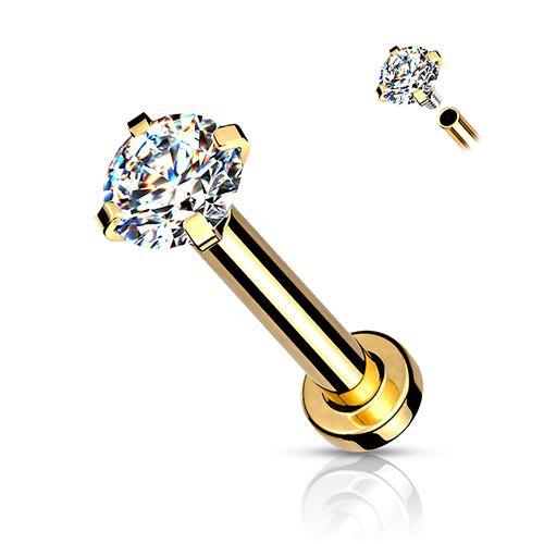 The 16 gauge labret is made from gold PVD coated 316L stainless steel with internal threading. Only the prong-set gem end is removable. Choose your gem size and color below.