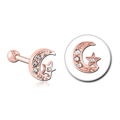 The 16 gauge moon & star cartilage barbell is made from rose gold PVD coated 316L stainless steel with external threading.
