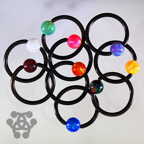 The 16 gauge captive bead ring is made from black PVD coated 316L stainless steel. Choose your size and synthetic opal color below.