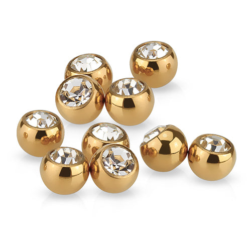 You'll get a two pack of rose gold PVD coated 316L stainless steel gem balls that fit most any 16g externally threaded barbell. The cz is available in clear only. Choose your size below.