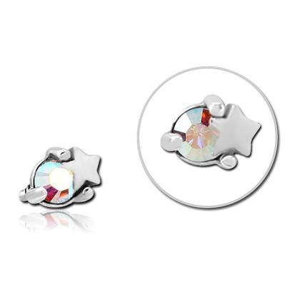 The 16 gauge cz and star end is made from 316L stainless steel. It measures approximately 4mm wide by 2.6mm high. These will fit most any 16 gauge internally threaded straight barbell or labret. We cannot guarantee compatibility with curved barbells. The cz is available in aurora borealis only.