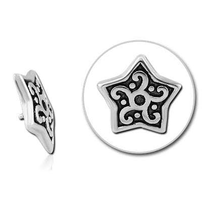 The 16 gauge fancy star is made from 316L stainless steel. It has a diameter of approximately 6.5mm. These will fit most any 16 gauge internally threaded straight barbell or labret. We cannot guarantee compatibility with curved barbells.