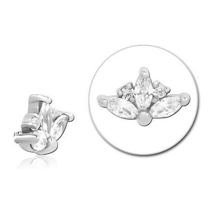 The 16 gauge multi-cz end is made from 316L stainless steel. It measures approximately 10mm wide by 6.3mm high. These will fit most any 16 gauge internally threaded straight barbell or labret. We cannot guarantee compatibility with curved barbells.