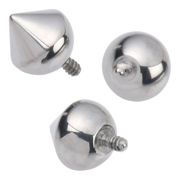 The 16 gauge ball spike replacement end is made from high polish grade 23 titanium (Ti 6Al-4V ELI ASTM F136). These will fit most any 16 gauge internally threaded straight barbell or labret. We cannot guarantee compatibility with curved barbells.