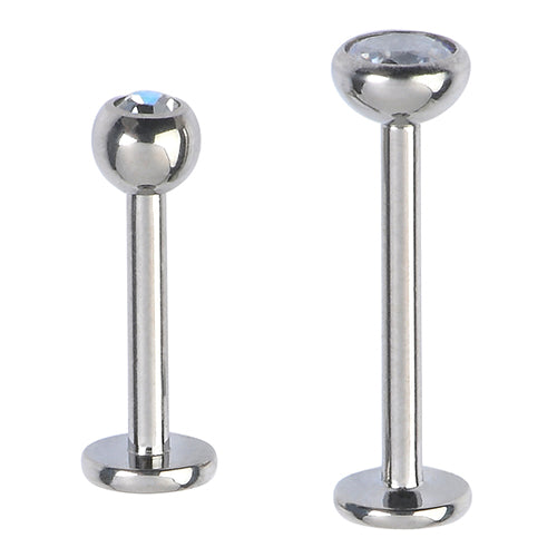 The 16 gauge labret barbell is made from high polish grade 23 titanium (Ti 6Al-4V ELI ASTM F136) with internal threading. Only the gem end is removable. The fixed disc end has a 4mm diameter. Available with a clear cz only. These cannot be returned or exchanged if you select a custom anodized barbell color. Only the high polish (plain silver) is eligible for our return policy. Choose your size below.