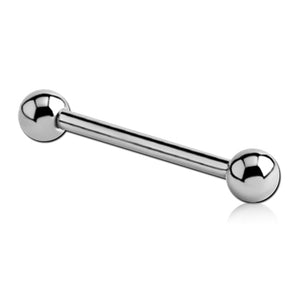 The 16 gauge straight barbell is made from high polish grade 23 titanium (Ti 6Al-4V ELI ASTM F136) with external threading. Both ball ends are removable. Choose your size below.