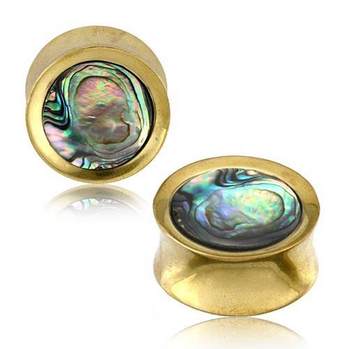These double flare plugs are made from yellow brass with abalone inlay. They have a wearable area of 3/8" between flares. Choose your size below.