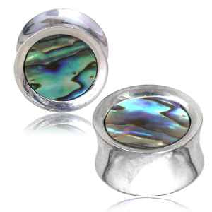 These double flare abalone inlaid plugs are made from silver plated brass. They have a wearable area of 7/16" between flares. Choose your size below.