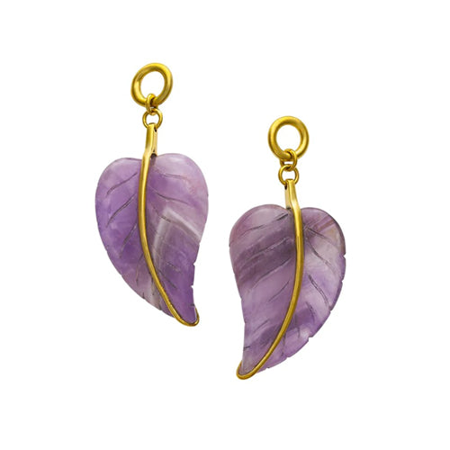 These amethyst leaf pendants are made with solid yellow brass by Diablo Organics. You'll get the two pendants only. Our product photo shows the larger, 65mm pair. They need to be combined with hooks/spirals that must purchased separately. Choose your size below.