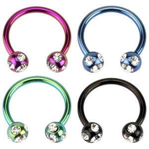 The 16 gauge circular barbell is made from PVD coated 316L stainless steel with external threading. Both multi-gem balls are removable. Gems are available in clear only. Choose your size and color below.