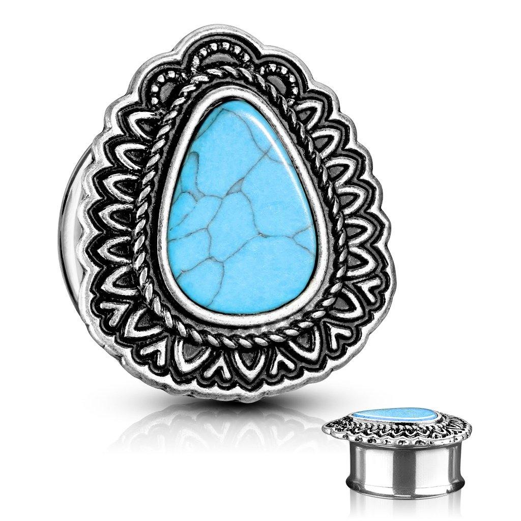 These double flare antique turquoise center plugs are made from 316L stainless steel. They have a teardrop front, but the wearable plug is just a regular round shape. They have a wearable area of 3/8" between flares. Choose your size below.