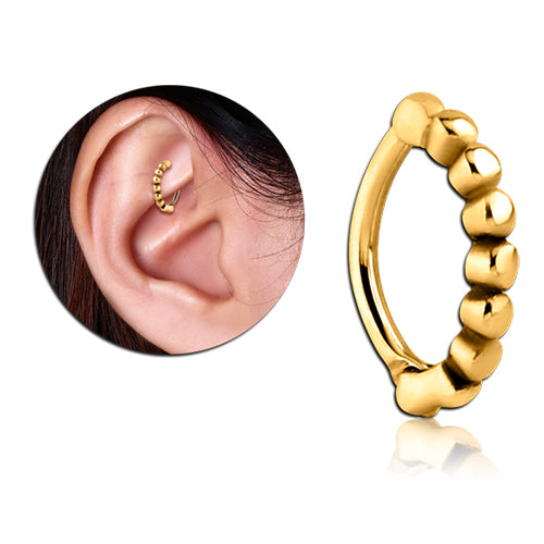 The 16 gauge beaded cartilage clicker is made from gold PVD coated 316L stainless steel with an interior diameter of 1/4". The curved barbell is 5/16" long, hinged on one side and snaps firmly shut on the other.