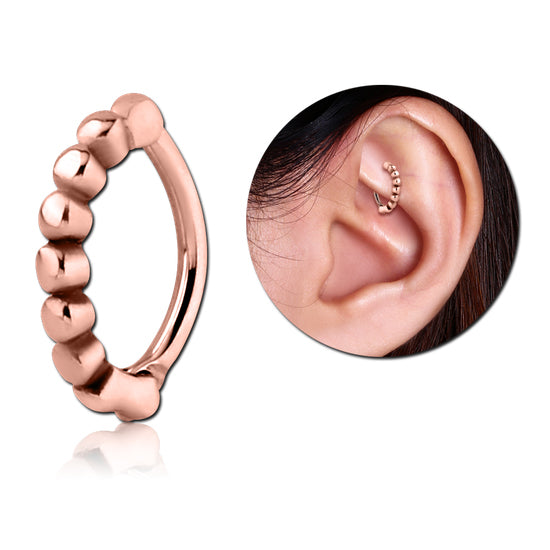 The 16 gauge beaded cartilage clicker is made from rose gold PVD coated 316L stainless steel with an interior diameter of 1/4". The curved barbell is 5/16" long, hinged on one side and snaps firmly shut on the other.