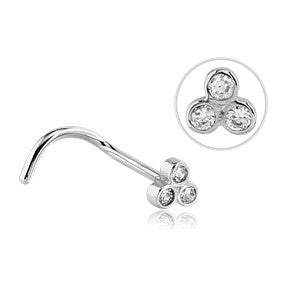 The trinity bezel cz nostril screw is made from 316L stainless steel. The gem cluster measures about 3.2mm high x 3.5mm wide. The bezel-set gems are available in clear only. Choose your size below.