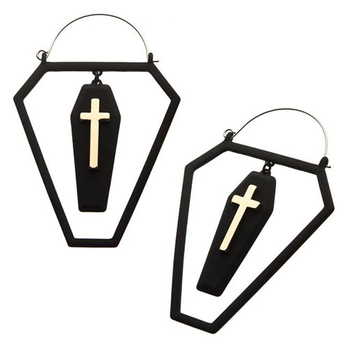 These 20 gauge black coffin tunnel hoop earrings have a black finish. The hinged post is made from 316L surgical steel. They can be worn as regular earrings, but the oversize design is intended to fit comfortably inside most flesh tunnels. Sold as a pair.