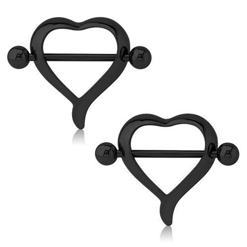 These 14 gauge heart nipple shields are made from black PVD coated 316L stainless steel. They have a 5/8" interior diameter except for the pinch point up top where the heart shape bends inward. The 14 gauge 7/8" straight barbells are externally threaded.
