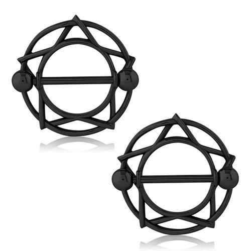 These 14 gauge star nipple shields are made from black PVD coated 316L stainless steel with an interior diameter of 5/8". The 14g straight barbells are made from 316L stainless steel with external threading.
