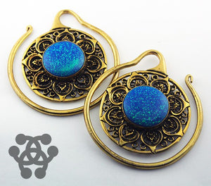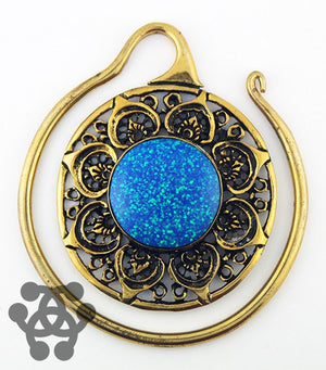 These mandala hoop ear weights are cast from solid yellow brass with synthetic blue opal cabochons by Oracle Body Jewelry. They fit stretched ear lobes sized 8 gauge or larger.