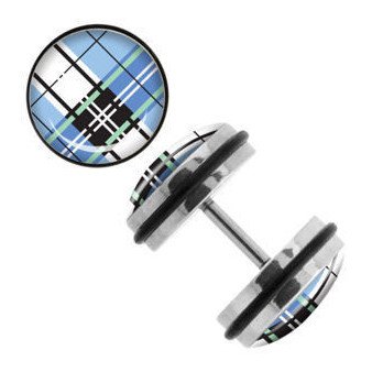 The 18 gauge blue plaid fake plugs are made from 316L stainless steel with external threading. The logo is encased in a clear acrylic dome. These are sold as a pair.