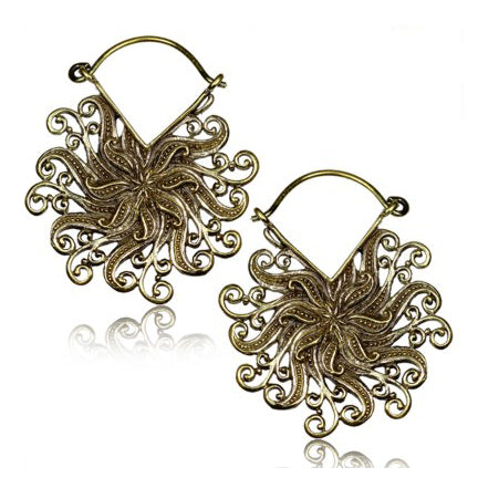 These 18 gauge floburst earrings are cast from solid yellow brass and approximately 1-3/8" tall x 1-5/8" wide. The wearable wire is made from sterling silver.