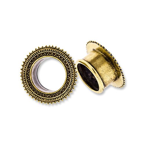 These double flare mayan tunnels are made from yellow brass. They have a wearable area of 5/16" between flares. Choose your size below.