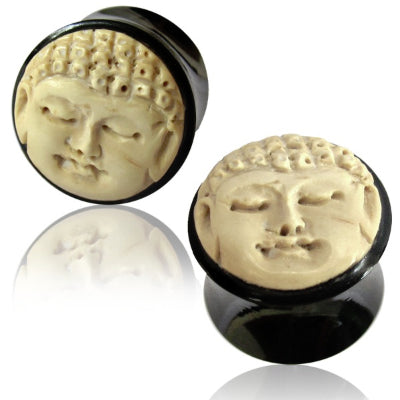 These double flare buddha face plugs are made from handcarved water buffalo horn with wood inlay. Choose your size below.
