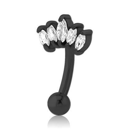 The 16 gauge crown cz eyebrow ring is made from black PVD coated 316L stainless steel with external threading. Only the bottom 3mm ball is removable.