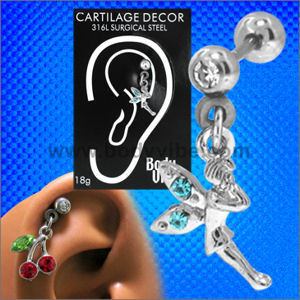 The 18 gauge cz fairy cartilage barbell is made from externally threaded 316L stainless steel. Only the ball end is removable.