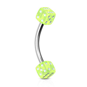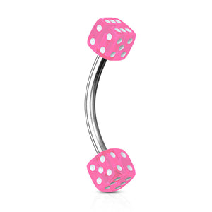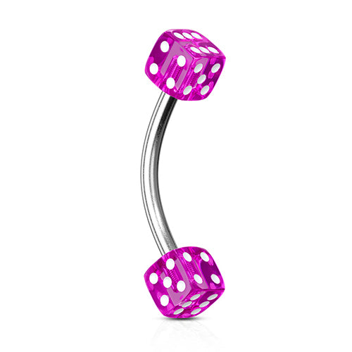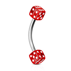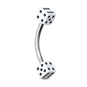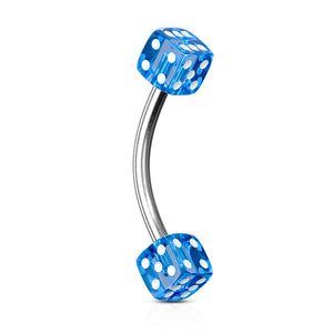 The 16 gauge curved barbell is made from 316L stainless steel with external threading. Both 4x4mm acrylic dice are removable. Choose your color below.