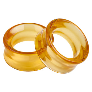 These double flare concave tunnels are made from transparent amber glass. They have a wearable area of 3/8" between flares. Choose your size below.