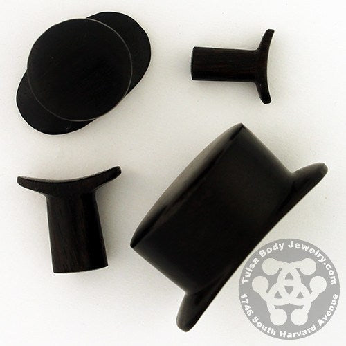 The T-back round labret is handcarved from ebony wood by Diablo Organics. The fronts are flared approximately 1mm larger than the gauge size. Choose your size below.