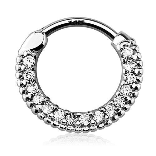 The 16 gauge fifteen cz septum clicker is made from solid white 14k gold. The 5/16" long curved barbell is hinged on one side and snaps firmly shut on the other. The interior diameter is 3/8", measured inside the clicker from top to bottom. The gems are available in clear only!