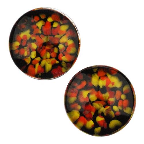 These double flare fire pebble plugs are made from hand blown borosilicate glass by Glasswear Studios. They can be worn backwards to show the plain glossy black side. Choose your size below.