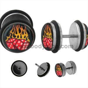 The 18 gauge flaming dice fake plugs are made from 316L stainless steel with external threading. The logo is encased in a clear acrylic dome. These are sold as a pair.