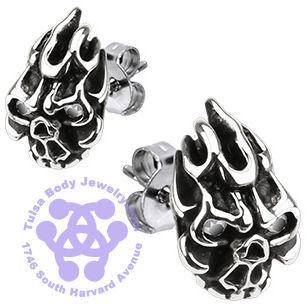These 22 gauge flaming skull stud earrings are made from cast 316L stainless steel.